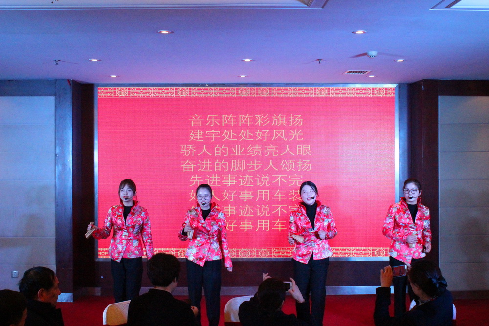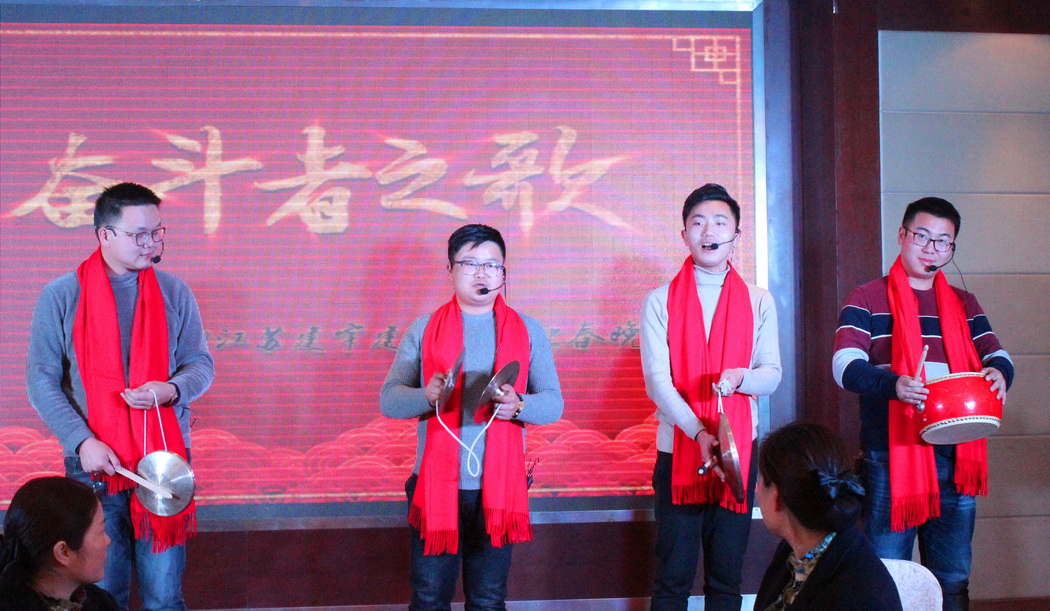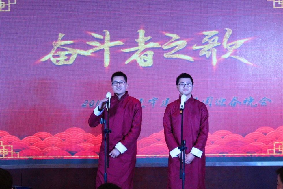 年會(huì)在董事長(zhǎng)管民良“奮斗、團(tuán)結(jié)”的致辭中開(kāi)場(chǎng),全體建宇人歡聚一堂,其樂(lè)融融。每個(gè)分公司、部門(mén)和集團(tuán)皇華酒店都為年會(huì)精心準(zhǔn)備了節(jié)目,展示大家工作能力以外的多才多藝,博得了陣陣掌聲,大家在歡聲笑語(yǔ)中分享成功,共敘友情。其中,工程部和財(cái)務(wù)部聯(lián)合表演的詩(shī)朗誦、市政公司的三句半、南京公司的相聲、皇華酒店的音樂(lè)快板才藝超群。最后集團(tuán)公司的高層領(lǐng)導(dǎo)們一曲《眾人劃槳開(kāi)大船》將年會(huì)推向了高潮。