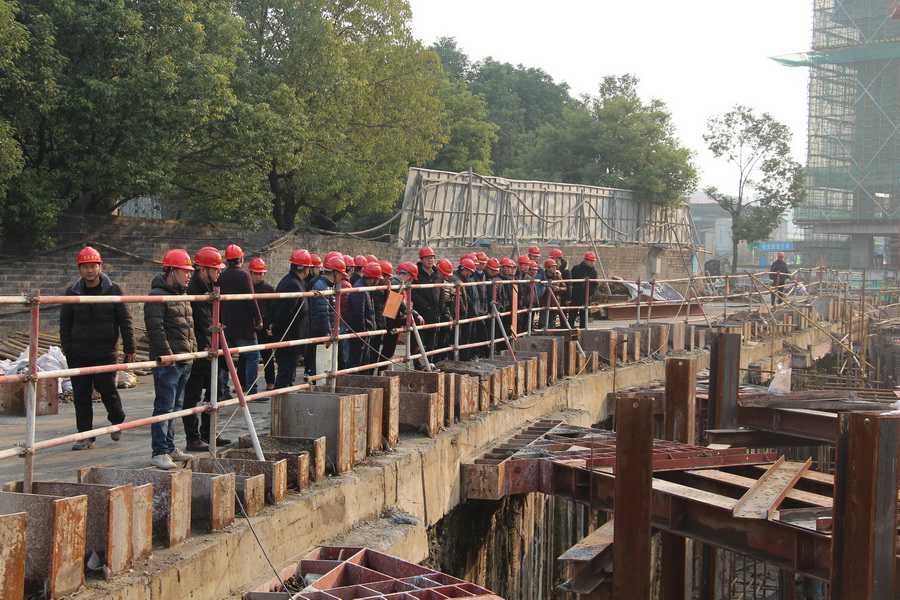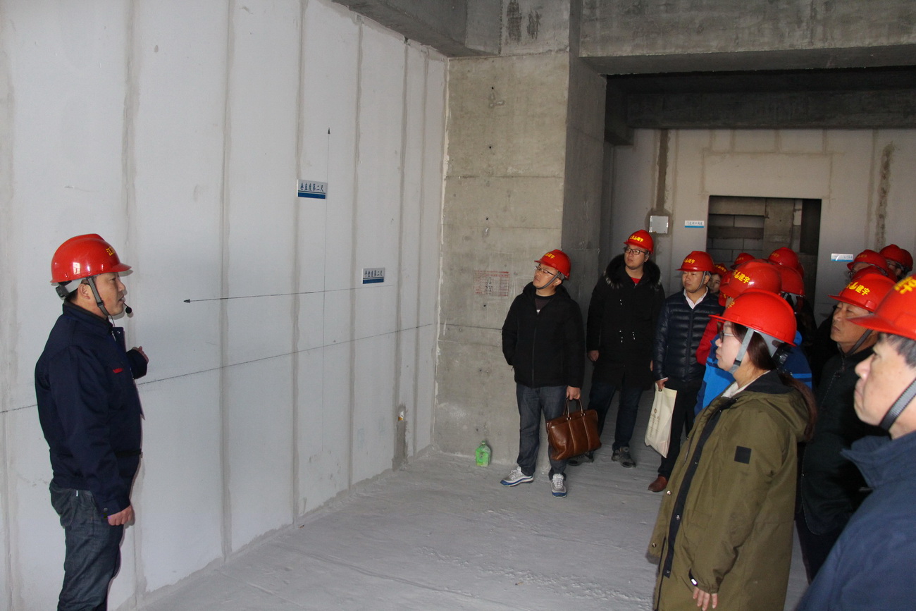 上午,觀摩團(tuán)一行首先來(lái)到了弘陽(yáng)項(xiàng)目施工現(xiàn)場(chǎng)進(jìn)行觀摩,聽(tīng)取了南京公司周月波副經(jīng)理關(guān)于弘陽(yáng)項(xiàng)目概況的簡(jiǎn)要介紹,隨后全體人員分成三組,在項(xiàng)目現(xiàn)場(chǎng)管理人員的帶領(lǐng)下深入施工場(chǎng)地進(jìn)行了細(xì)致地學(xué)習(xí)與了解,重點(diǎn)觀摩了單體地上建筑面積達(dá)6萬(wàn)平方的1號(hào)樓,觀看了1號(hào)樓西側(cè)一層頂板懸挑長(zhǎng)度達(dá)到5.6m的懸挑梁、6-13層錯(cuò)層位置內(nèi)側(cè)搭設(shè)的高度達(dá)到了31.2m高支模滿堂腳手架、7層輕質(zhì)隔墻ALC板內(nèi)隔墻安裝施工樣板、采用了SMW工法樁深基坑支護(hù)體系和型鋼混凝土支撐體系等重難點(diǎn)部位及制作精致的施工樣板區(qū)。