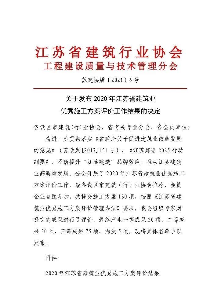 近日,江蘇省建筑行業(yè)協(xié)會(huì)工程建設(shè)質(zhì)量與技術(shù)管理分會(huì)發(fā)布了2020年江蘇省建筑業(yè)優(yōu)秀施工方案評(píng)價(jià)工作結(jié)果的決定,集團(tuán)5項(xiàng)施工方案獲評(píng)優(yōu)秀,企業(yè)技術(shù)、管理創(chuàng)新再添佳績(jī)。