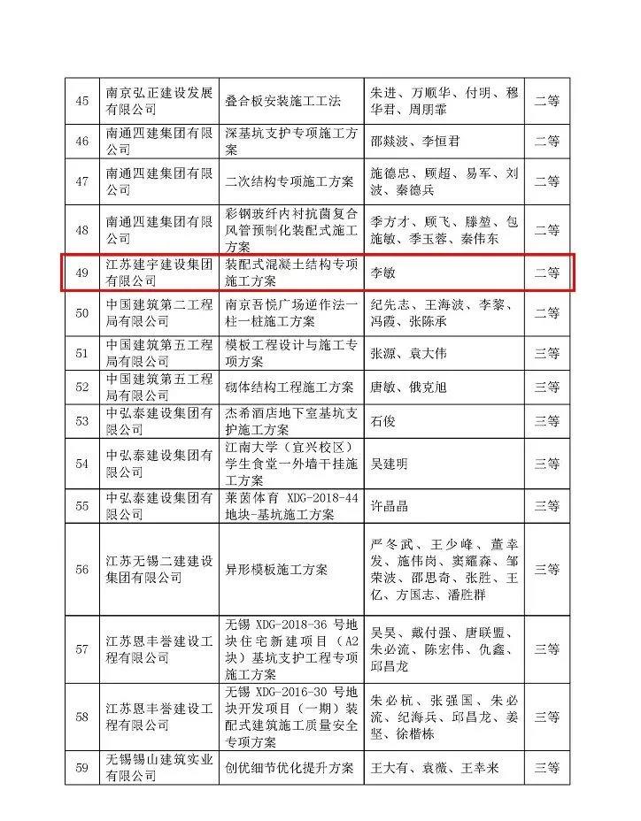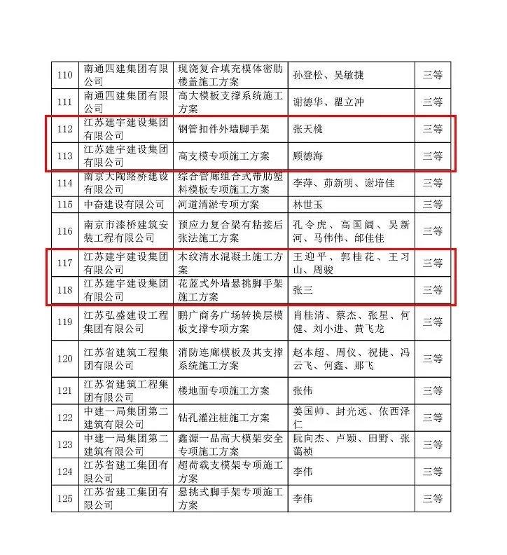 集團(tuán)公司報(bào)送的5項(xiàng)專項(xiàng)施工方案。其中,南京分公司編制的《裝配式混凝土結(jié)構(gòu)專項(xiàng)施工方案》獲評(píng)二等獎(jiǎng),《鋼管扣件外墻腳手架》、《高支模專項(xiàng)施工方案》獲評(píng)三等獎(jiǎng);高郵分公司編制的《木紋清水混凝土施工方案》、《花籃式外墻懸挑腳手架施工方案》獲評(píng)三等獎(jiǎng)。