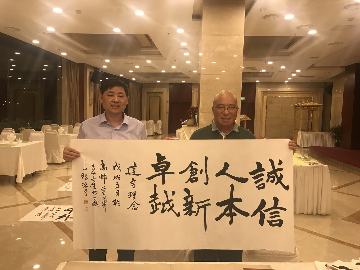 蘇企聯(lián)盟的各位企業(yè)家結(jié)合自身的實際做了交流互動,大家紛紛表示今后與集團加強合作,發(fā)揮各企業(yè)的優(yōu)勢,互相取長補短、共贏市場。安微省黃山市文化委書記,著名書法家、詩人山鵬老師也一同參加上述活動,并現(xiàn)場揮毫作書“誠信、人本、創(chuàng)新、卓越”的建宇理念。