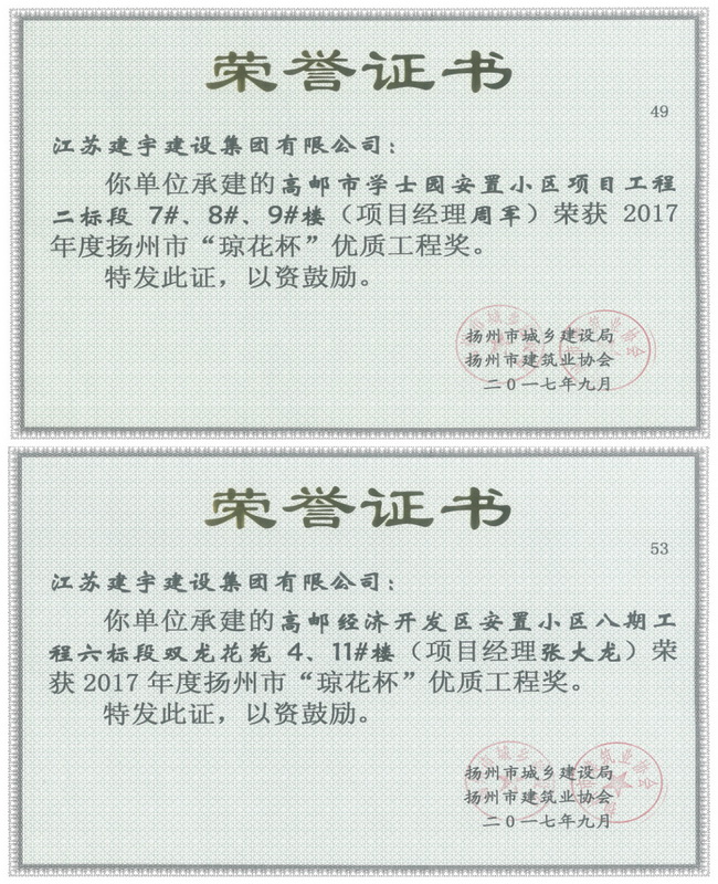 揚(yáng)州市“瓊花杯”優(yōu)質(zhì)工程獎(jiǎng)是揚(yáng)州市建設(shè)工程質(zhì)量最高榮譽(yù)獎(jiǎng),評(píng)審工作由市建筑業(yè)協(xié)會(huì)負(fù)責(zé)實(shí)施。近年來(lái)標(biāo)準(zhǔn)要求更高,數(shù)量控制更嚴(yán)。申報(bào)省“瓊花杯”優(yōu)質(zhì)工程獎(jiǎng),必須具備市優(yōu)質(zhì)結(jié)構(gòu)、市級(jí)文明工地、工程建設(shè)QC成果等多項(xiàng)要求。