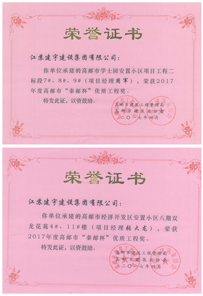 由高郵市建筑工程管理局和高郵市建筑業(yè)協(xié)會組織的2017年度高郵市“秦郵杯”建筑(裝飾、市政)優(yōu)質工程評選結果日前揭曉,集團高郵公司承建的“高郵市學士園安置小區(qū)項目工程二標段7#、8#、9#樓”和“高郵市經濟開發(fā)區(qū)安置小區(qū)八期雙龍花苑4#、11#樓”兩項工程獲獎。