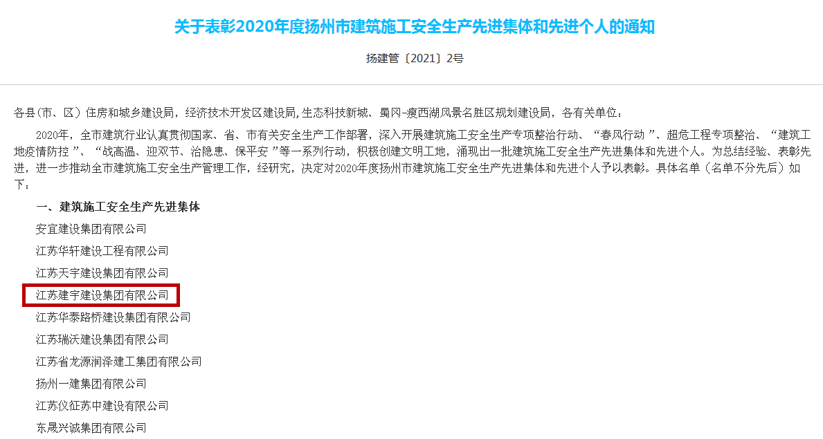 近日,集團又一次被揚州市人民政府評為2020年度揚州市建筑業(yè)先進企業(yè),這是集團第十次獲此殊榮。同時集團第五次榮獲2020年度揚州市建筑施工安全生產(chǎn)先進集體,孫曉建同志榮獲優(yōu)秀班組長。