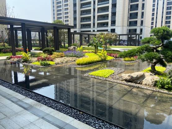 項目各方人員頂著高溫酷暑、優(yōu)化施工方案、協(xié)調(diào)各工種之間的穿插施工、抓進(jìn)度保質(zhì)量,按時保質(zhì)的將北湖藍(lán)灣的新中式示范區(qū)北側(cè)園林打造出來。