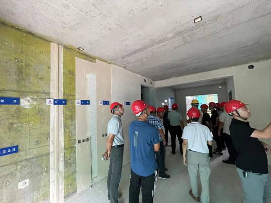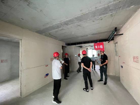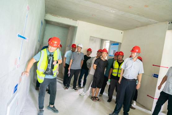 全體觀摩人員同樣分成了三組,在項(xiàng)目現(xiàn)場(chǎng)管理人員的帶領(lǐng)下深入施工場(chǎng)地,重點(diǎn)觀摩了14#樓、22#樓、26#樓粉刷施工工藝樣板、實(shí)測(cè)實(shí)量樣板;預(yù)制剪力墻、預(yù)制疊合板、預(yù)制樓梯、ALC板等施工成型質(zhì)量情況。
