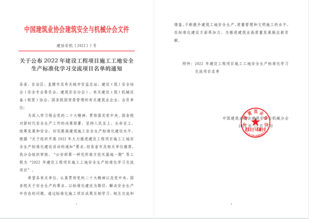 近日,中國(guó)建筑業(yè)協(xié)會(huì)安全與機(jī)械分會(huì)發(fā)布了2022年建設(shè)工程項(xiàng)目施工工地安全生產(chǎn)標(biāo)準(zhǔn)化學(xué)習(xí)交流項(xiàng)目名單,集團(tuán)南京分公司承建的國(guó)際化名醫(yī)中心項(xiàng)目安全標(biāo)準(zhǔn)化建設(shè)成績(jī)顯著,被授予“國(guó)家安全生產(chǎn)標(biāo)準(zhǔn)化項(xiàng)目”榮譽(yù)稱(chēng)號(hào)(原國(guó)家AAA工地)。