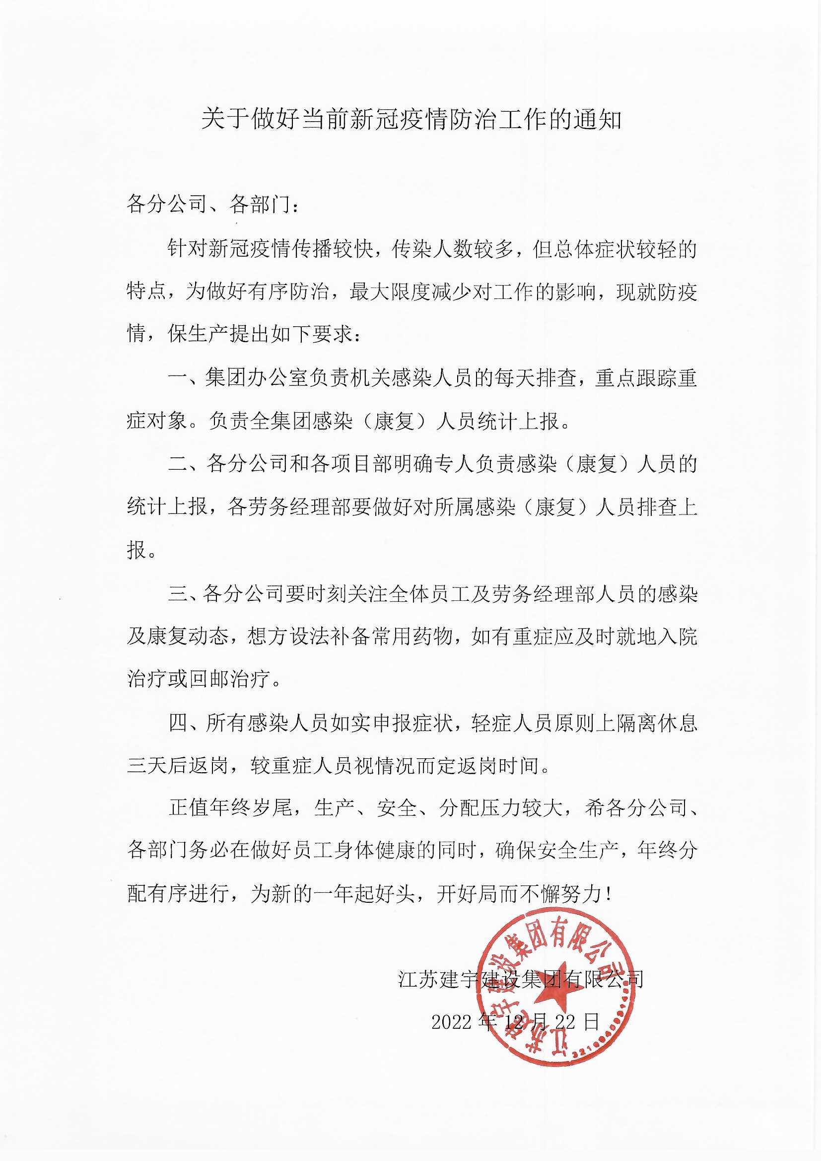 隨著疫情防控新十條的發(fā)布,集團(tuán)針對疫情防控面臨新形勢、新階段、新任務(wù),及時調(diào)整防控策略,及時發(fā)布了《關(guān)于做好當(dāng)前新冠疫情防控通知》,各分公司迅速貫徹實施,根據(jù)每天感染情況,積極作為。