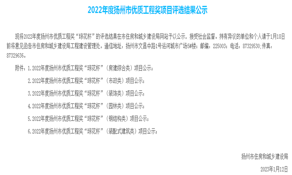 揚(yáng)州市“瓊花杯”優(yōu)質(zhì)工程獎(jiǎng)是揚(yáng)州市建設(shè)工程質(zhì)量最高榮譽(yù)獎(jiǎng),代表著全市范圍內(nèi)各建筑施工企業(yè)質(zhì)量管理的領(lǐng)先水平,評審標(biāo)準(zhǔn)高,數(shù)量控制嚴(yán)。申報(bào)省“瓊花杯”優(yōu)質(zhì)工程獎(jiǎng),必須具備市優(yōu)質(zhì)結(jié)構(gòu)、市級標(biāo)化工地、工程建設(shè)QC成果等多項(xiàng)要求。