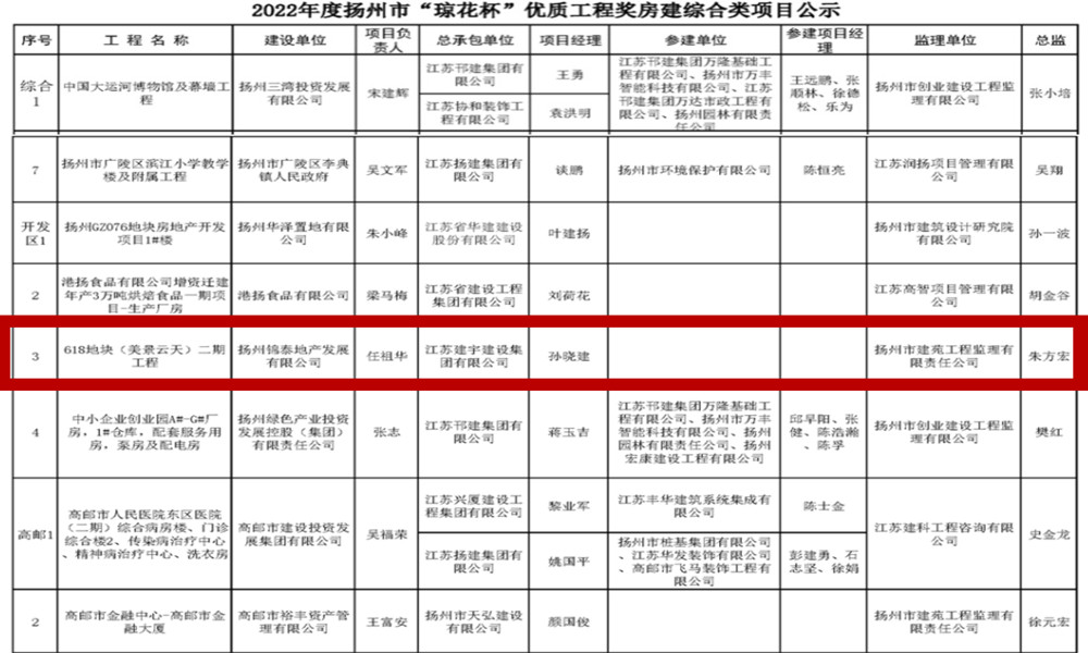 日前,2022年度揚(yáng)州市優(yōu)質(zhì)工程獎(jiǎng)項(xiàng)揭曉,集團(tuán)揚(yáng)州分公司承建的“618(美景云天)二期工程”項(xiàng)目,被揚(yáng)州市住房和城鄉(xiāng)建設(shè)局表彰為揚(yáng)州市“瓊花杯”優(yōu)質(zhì)工程獎(jiǎng)。此前,揚(yáng)州分公司天賦星辰和錦麟世紀(jì)項(xiàng)目還分別獲得省標(biāo)化星級工地,多個(gè)項(xiàng)目榮獲市標(biāo)化工地、新技術(shù)應(yīng)用示范工程。