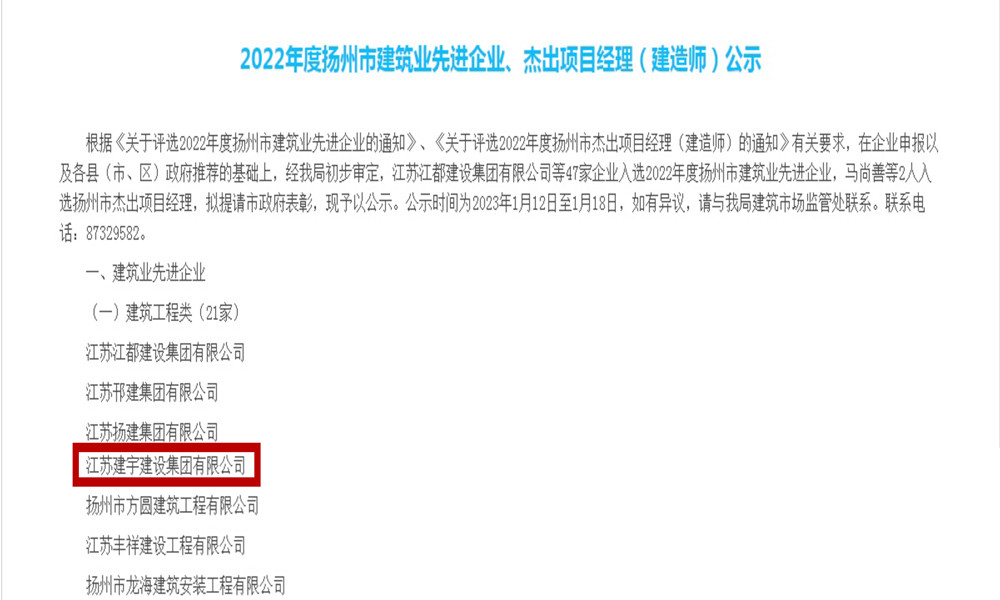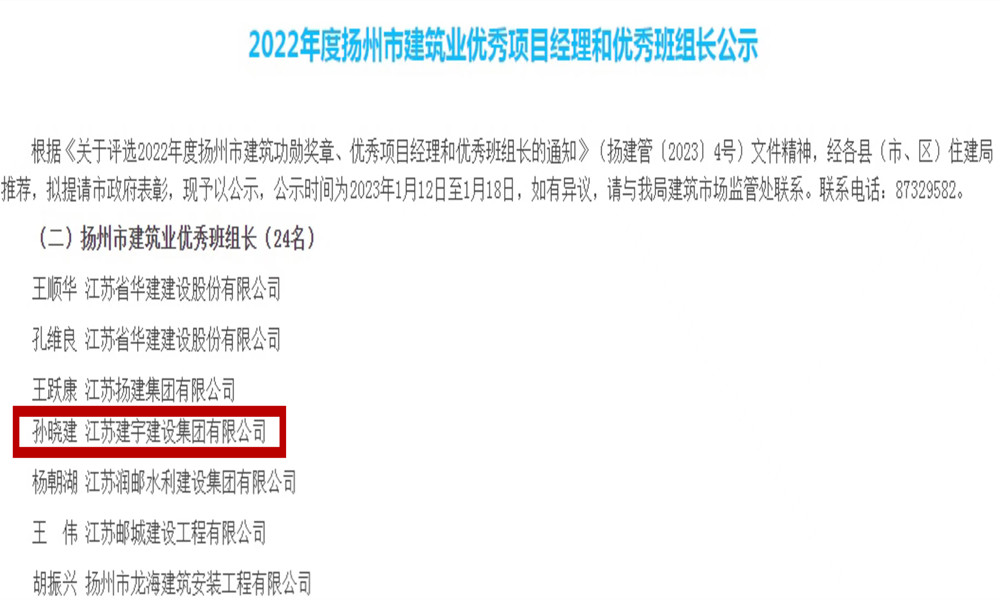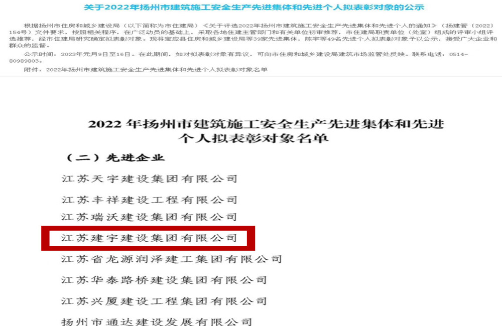 近日,集團(tuán)被揚(yáng)州市人民政府評為2022年度揚(yáng)州市建筑業(yè)先進(jìn)企業(yè),這是集團(tuán)第十二次獲此殊榮。同時,集團(tuán)被揚(yáng)州市住房和城鄉(xiāng)建設(shè)局評為2022年度揚(yáng)州市建筑施工安全生產(chǎn)先進(jìn)集體,孫曉建同志榮獲建筑業(yè)優(yōu)秀班組長。