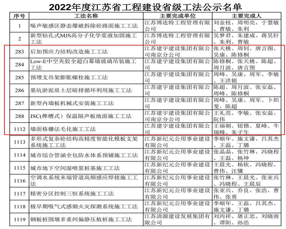 近日,從江蘇省住房城鄉(xiāng)住建廳傳來(lái)喜訊,集團(tuán)申報(bào)的《后加預(yù)應(yīng)力結(jié)構(gòu)改造施工工法》、《Low-E中空夾膠全超白幕墻玻璃吊裝施工工法》、《預(yù)埋支吊架膨脹螺栓施工工法》、《基坑淤泥質(zhì)土層暗排循環(huán)利用施工工法》、《新型內(nèi)墻板機(jī)械式安裝施工工法》、《JSC(榫槽式)保溫隔聲板地面施工工法》、《墻面格柵法毛化施工工法》七項(xiàng)工法技術(shù)順利通過(guò)專(zhuān)家網(wǎng)評(píng),獲評(píng)江蘇省住房建設(shè)廳2022年度省級(jí)施工工法,單次獲評(píng)數(shù)量名列行業(yè)前茅、企業(yè)科技創(chuàng)新再添佳績(jī)。
