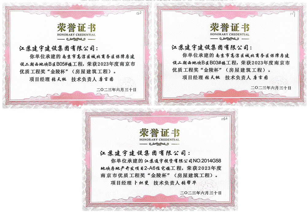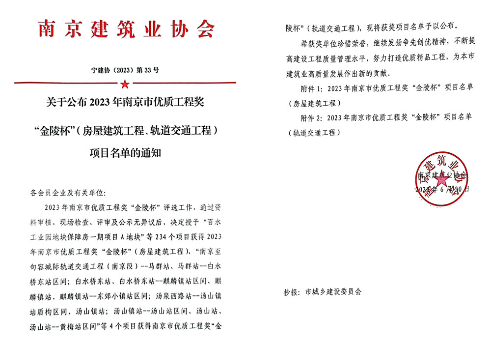 “金陵杯”是南京市建筑工程質量領域的最高榮譽,代表著全市范圍內各建筑施工企業(yè)質量管理的領先水平,評審標準高,數量控制嚴。南京分公司嚴抓管理,不畏強手,承建的高淳區(qū)城北商務區(qū)保障房建設二期西地塊B區(qū)B03#、B05#、江蘇通宇房地產開發(fā)項目2-A6住宅樓等三個項目榮獲2023年南京市優(yōu)質工程獎“金陵杯”。