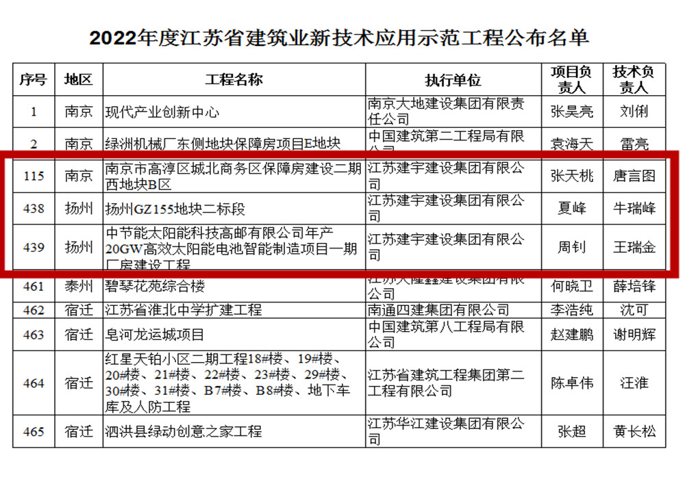 江蘇省建筑業(yè)新技術應用示范工程是指新技術含量高,在全省有一定規(guī)模和影響的工程。集團南京分公司承建的高淳區(qū)城北商務區(qū)保障房、揚州分公司承建的GZ155地塊二標段和高郵分公司承建的中節(jié)能一期廠房建設工程等三個項目榮獲2022年度江蘇省建筑業(yè)新技術應用示范工程。