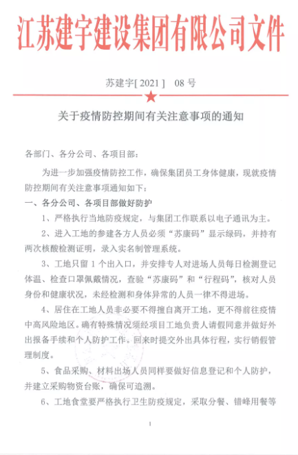 各部門和分公司迅速召開疫情防控專題會(huì)議,傳達(dá)集團(tuán)疫情防控要求,對(duì)防控工作作出安排。尤其是身處疫情中心的南京和揚(yáng)州分公司各項(xiàng)目部,自疫情爆發(fā)后,各項(xiàng)目部堅(jiān)決執(zhí)行當(dāng)?shù)匾咔榉揽匾?guī)定。