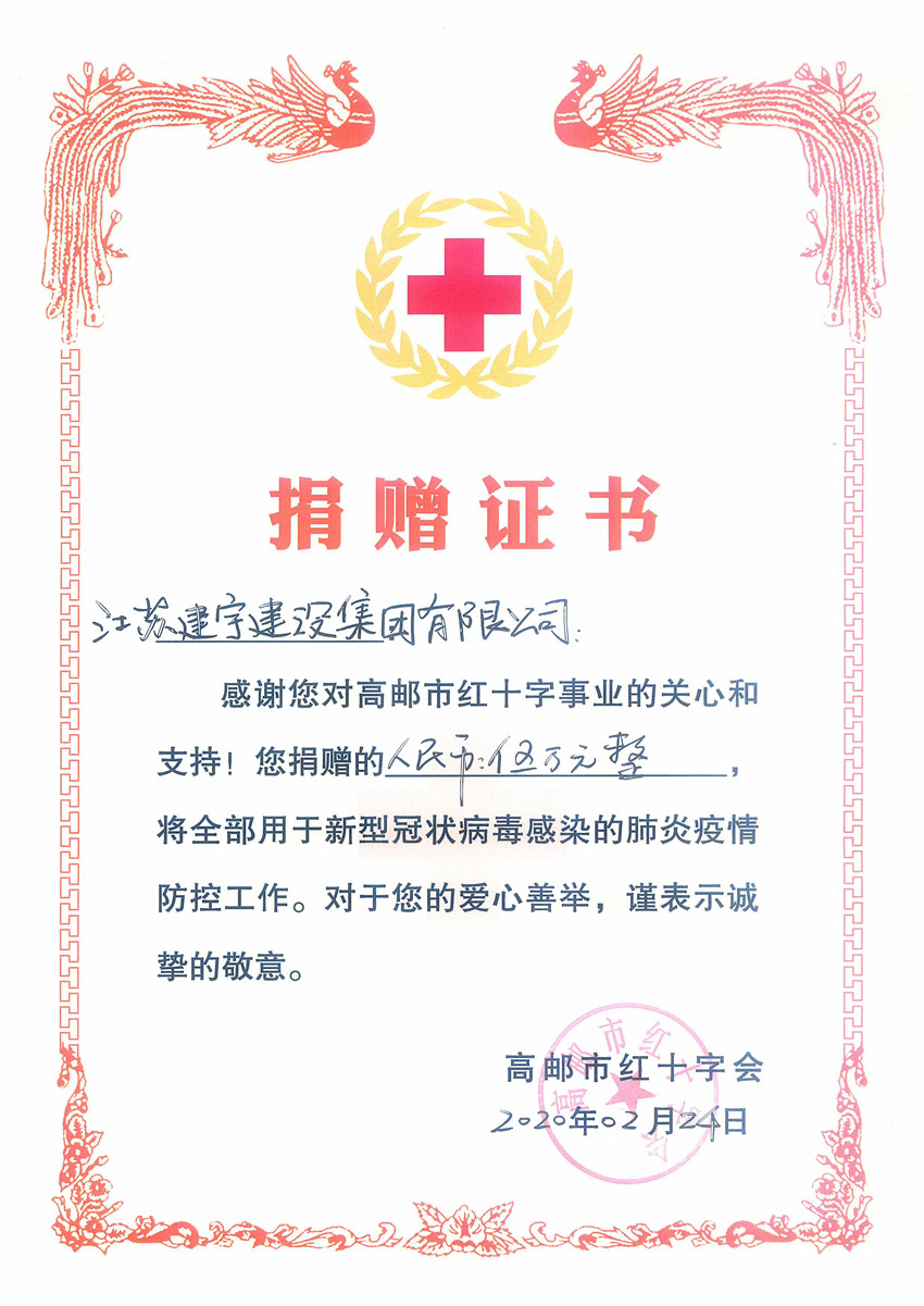 捐贈(zèng)儀式上,集團(tuán)董事長(zhǎng)管民良表示,新冠肺炎疫情牽動(dòng)著國(guó)人的心,建宇集團(tuán)積極參與抗疫,集團(tuán)旗下皇華大酒店堅(jiān)守多日,為市防疫指揮部提供優(yōu)服務(wù);集團(tuán)此前已通過(guò)南京市高郵商會(huì)等多途徑奉獻(xiàn)愛(ài)心,此次再捐贈(zèng)5萬(wàn)元用于抗擊新冠肺炎疫情。周鎮(zhèn)長(zhǎng)等領(lǐng)導(dǎo)對(duì)集團(tuán)的善行義舉和愛(ài)心捐贈(zèng)表示真誠(chéng)的感謝,并現(xiàn)場(chǎng)頒發(fā)愛(ài)心證書(shū),稱(chēng)贊集團(tuán)此舉是作為市、鎮(zhèn)重點(diǎn)建筑企業(yè)勇于承擔(dān)社會(huì)責(zé)任的體現(xiàn)。
